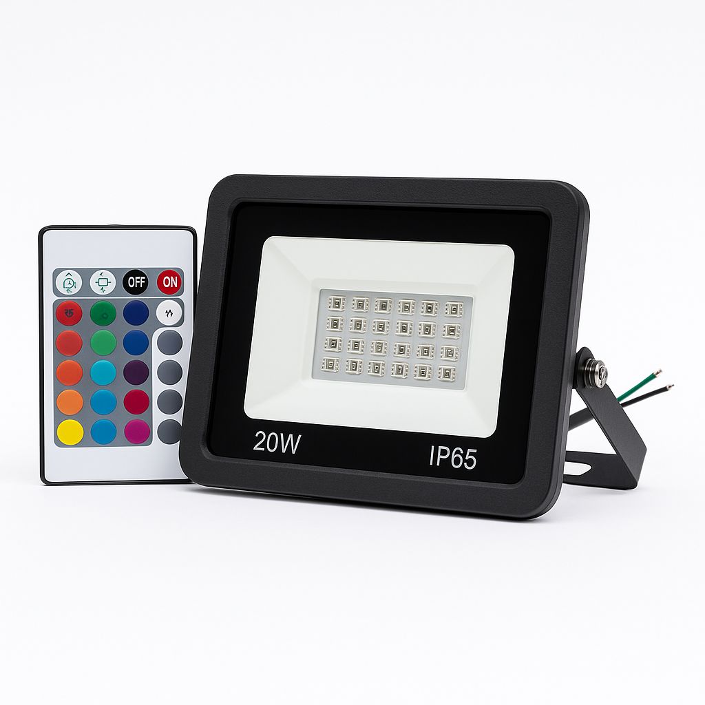 Reflector LED RGB de 20W para uso exterior. Fabricado en aluminio y cristal templado, con grado de protección IP66. Produce luz multicolor controlada mediante control remoto (incluido). Ideal para iluminación decorativa en jardines, fachadas o áreas recreativas. Dimensiones: 110×85×20 mm. Encendido manual.